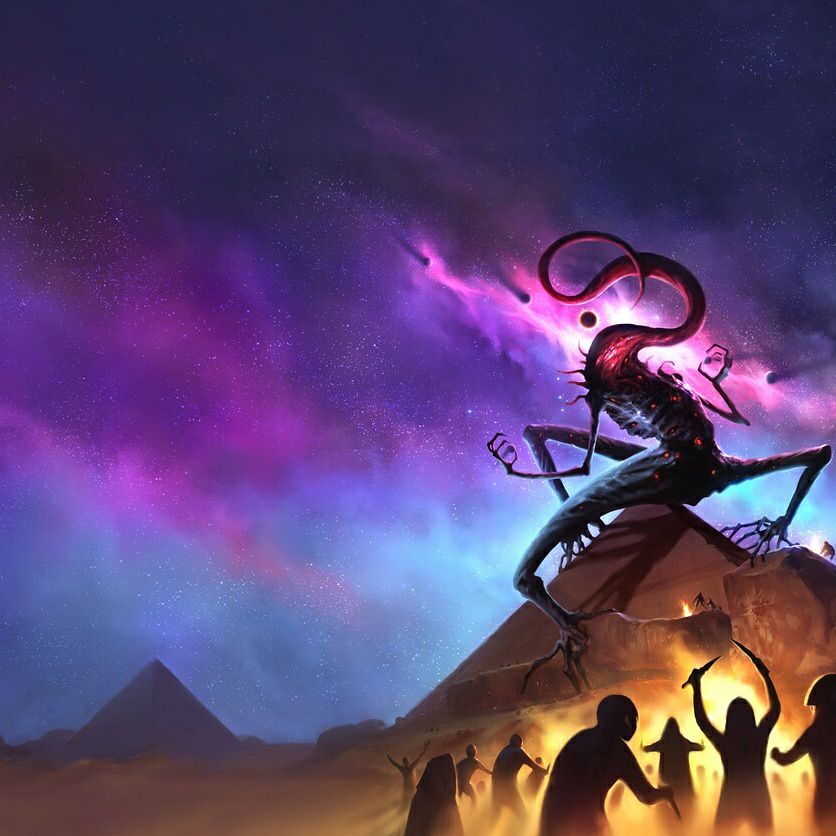 Nyarlathotep en pharaon monstrueux ou sous les traits de l'Homme noir.