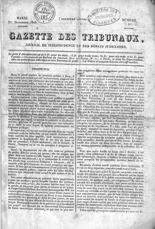 width=La Gazette des tribunaux (Journal de jurisprudence et des débats judiciaires) est créée en novembre 1825. Hebdomadaire, elle propose des articles de droit, et (surtout) le compte rendu des « affaires intéressantes » (justice civile et criminelle) ainsi que la chronique des faits divers. Cette gazette a constitué une mine de renseignements pour les romanciers.