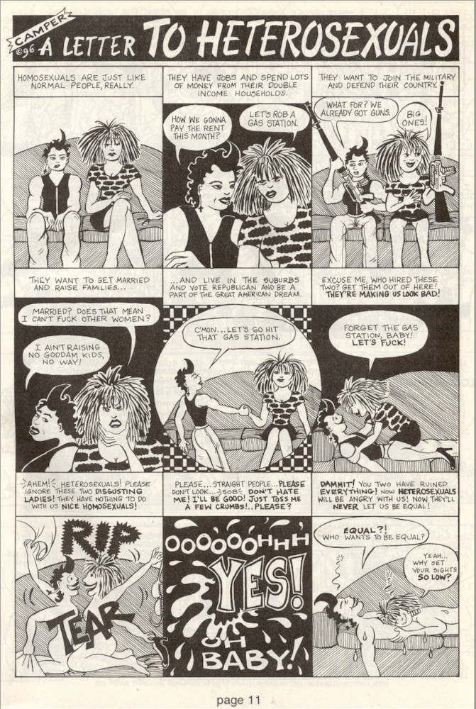 Camper extirpe la relation homosexuelle du giron et de la subordination de l’hétérosexualité ; la radicalité des protagonistes les émancipe du jugement hétérosexuel. En rejetant l’homonormativité, cette séquence refuse de s’énoncer sous un monolithe, sous une figure édulcorée et essentialisée d’une homosexualité. La dichotomie entre un agenda hétérosexuel et homosexuel s’inscrit jusque dans le titre de l’histoire qui évoque une lettre, faisant écho à la dimension pamphlétaire de la séquence. Le projet du mariage fait ici partie intégrante de toute l’appareil normatif assimilationniste que l’autrice rattache à une institution monogame enfreignant le potentiel libérateur d’une politisation de l’homosexualité qui doit se penser en dehors d’un système de valeurs hétérosexuel. A Letter to Heterosexuals est un des exemples les plus illustratifs d’un contenu de bande dessinée profondément libérationniste, qui défend une affirmation radicale de soi se faisant sans concession octroyée aux normes conformistes.