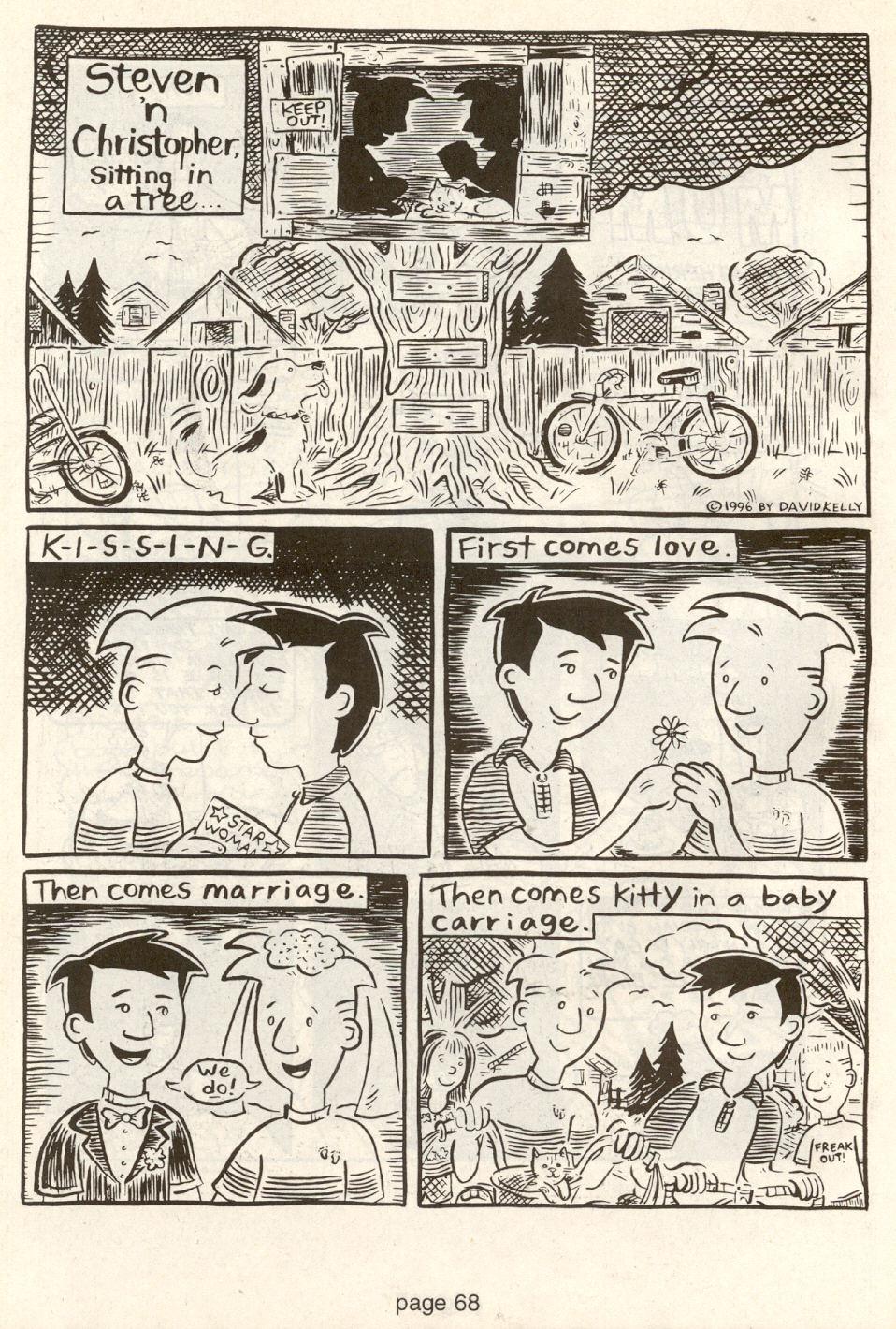 La contribution de David Kelly est une planche, aussi publiée dans le numéro 25, qui se nomme Steven ‘n Christopher sitting in a tree. Cette séquence met en exergue l’évolution de la politisation des luttes homosexuelles qui s’éloignent petit à petit de la dimension révolutionnaire engendrée par Stonewall pour se ré-insérer progressivement dans une conceptualisation de l’homosexualité qui se forme dans le moule de l’hétérosexualité. Contrairement à Jennifer Camper, David Kelly fait partie de la troisième et dernière génération d’auteurs ayant participé à Gay Comix. Il observe deux apparitions dans la revue aux numéros 23 et 25. On retient David Kelly surtout pour sa série Steven qui retrace l’histoire et les fantaisies d’un petit garçon homosexuel. La série de David Kelly est illustrative de cette nouvelle génération d’auteurs qui débarquent au milieu des années 90 sur la scène de la bande dessinée alternative et qui propose une approche plus normalisée d’une homosexualité moins contestataire.