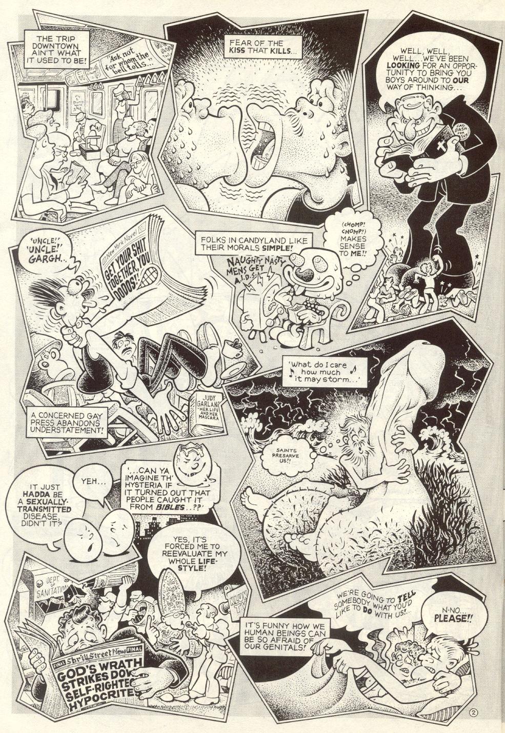 La première mention du SIDA dans Gay Comix apparait au numéro 4 de novembre 1983 dans le récit Safe Sex d’Howard Cruse, qui y représente la cacophonie et la panique ressenties à cette période-là. La bd comporte une mise en page déstructurée comme un puzzle ou un miroir brisé, qui se veut être une sorte de conglomérat discordant de toutes les tergiversations et autres commentaires d’une société dépassée par l’ampleur et la gravité d’une crise dont on ne sait alors que peu de choses. Cette planche fait office d’une véritable capsule temporelle qui nous projette dans l’émotion d’un instant T tragique. Elle traduit la porosité du médium vis-à-vis de son contexte de production. Puis, on constate que dès l’avènement de la crise du SIDA, les représentations de la sexualité vont drastiquement se reconfigurer vers des formes plus respectables, suggérant l’impact structurant du SIDA dans la représentation de l’homosexualité. Le SIDA émerge donc comme un élément exogène ayant potentiellement accéléré et favorisé la trajectoire assimilationniste de Gay Comix. La crise du SIDA - en poussant de nombreux homosexuel.le.s à faire leur coming-out et à se mobiliser autour de campagnes de prévention - a transformé la perception collective de l’homosexualité et en a favorisé son acceptation. Ces coming-out collectifs et l’urgence sanitaire finissent par intégrer les débats politiques, marquant un tournant lors de l’élection américaine de 1992. Pour la première fois, un clivage autour de la question homosexuelle se dessine entre démocrates et républicains. Les démocrates, par la campagne de Bill Clinton s’ouvrent à la cause homosexuelle, en voulant rendre l’armée accessible aux personnes homosexuelles.