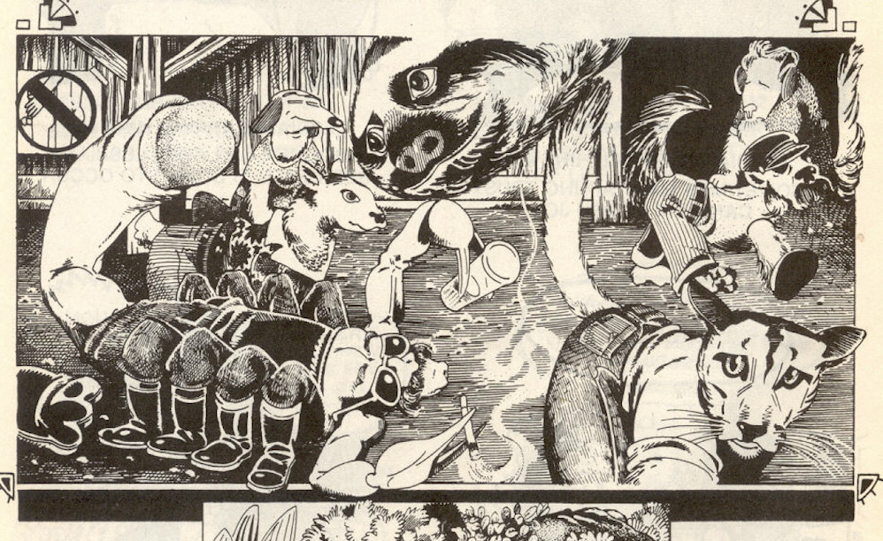 L’introduction prend place dans un bar rempli d’êtres mi-humains, mi-bêtes. Surréaliste, Le Scorpion est affublé d’apparats qui émergent dans la page comme autant d’incohérences visuelles. Dans sa pince gauche une bière, dans sa pince droite une clope. La gueule du Scorpion corrobore des traits d’humains qui se poursuivent, sans cou, sur sa morphologie d’arthropode. Il porte des lunettes de soleil et une grosse moustache qui cache la partie supérieure d’un solide menton carré finalisant la panoplie d’un style leather. Ceinturé sur toute sa longueur, son abdomen se prolonge littéralement sur une queue, un dard qui prend l’ostentatoire aspect d’un pénis dont la courbure ligamenteuse se termine par un gland massif et décalotté, prêt à dégainer. La figure du scorpion mobilise celle d’un animal à éviter dont la dangerosité s’inscrit dans son épine, contenant un poison mortel. Vaughn Frick décide de représenter très explicitement le dard par le pénis, qui devient cette arme cruelle, capable d’empoisonner ce qu’il pénètre. C’est l’allégorie de la sexualité qui tue, par laquelle on transmet la maladie. Une interprétation logique de ce récit, serait que le Scorpion représente le séropositif, perçu par les autres comme cet animal perfide et dangereux, condamné à vivre une vie solitaire dans le dégoût de tous. On note le trait particulier de Vaughn Frick. Très anguleux, il reproduit avec une grande finesse les textures comme celle du pelage du paresseux ou les plis charnus de la verge qui s’ourlent sur le gland, dont la carnation bulbeuse est traitée avec le plus grand des soins. La composition de l’image joue sur les superpositions d’éléments instables qui surgissent des limites de la case, créant un sentiment de chaos visuel. Le rendu graphique de Vaughn Frick, tout en noir et blanc par un trait de plume fine rappelle les estampes gravées des maîtres flamands, à la fois délirantes et terrifiantes. Sorte d’hybridation dégénérescente entre Brueghel et Tom of Finland. En arrière-fond, collé contre un mur en bois, un panneau interdisant la sodomie contextualise visuellement cet espace comme les ruines d’une Gomorrhe calcinée par une pandémie dévastatrice.