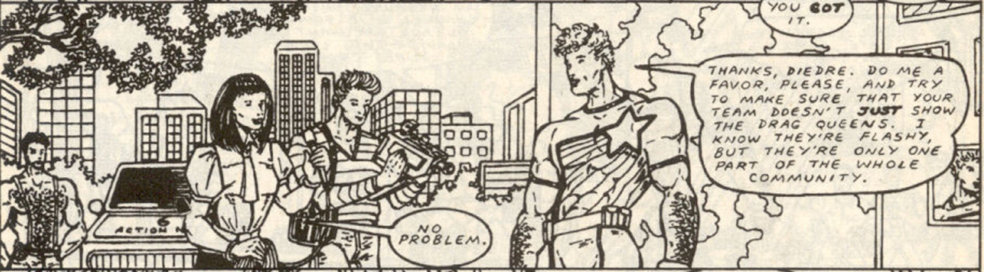 Iconographiquement, Sentinel/Pride représente une forme d’hégémonie masculine. L’hégémonie masculine est définie comme la valorisation de la force physique, du contrôle de soi, de l’agression, d’une virilité exacerbée. Physiquement, Sentinel/Pride arbore une virilité excessive par des muscles surdimensionnés et une pilosité dense. En outre, Sentinel/Pride est blanc, blond et ses yeux sont bleus. Ses pouvoirs impliquent la capacité de voler, de posséder une force surhumaine et de changer d’habits instantanément en un claquement de doigts. Ce dernier pouvoir donne une dimension camp au personnage qui change d’outfit à l’envi. En outre, la dimension de l’hégémonie masculine de Sentinel/Pride se traduit aussi par son comportement profondément stoïque et volontiers moralisateur. Plusieurs fois dans le récit, Sentinel/Pride aborde une posture paternaliste qui tend à instaurer une hiérarchie sur les autres personnages LGBT. Ainsi au numéro 17, le feuilleton Pride and Joy, met en scène le super-héros star d’une gay pride. Le récit se cristallise dans une discussion que le protagoniste entretient avec un collègue super-héros : Captain Chrome. Ce dernier est aussi homosexuel mais, contrairement à Sentinel/Pride qui n’a pas une expression ostentatoire de sa sexualité, Captain Chrome arbore un costume très sexualisé leather, presque nu et cinglé d’un harnais qui évoque la sous-culture kinky (Le kink est définit par l’ensemble des comportements sexuels non-conventionnels). Durant leur discussion, Sentinel/Pride partage ouvertement ses doutes sur les « méthodes » de Chrome, qui lui ont fait « lever les sourcils ». Cette discussion est particulièrement intéressante à mettre en exergue avec la philosophie du « Don’t Ask, Don’t Tell », impliquant que l’homosexualité est tolérable tant que celle-ci demeure non-ostentatoire. La série se crée en 1992 à un moment pivot de la normalisation homosexuelle caractérisée par l’élection de Bill Clinton. Ce dernier intègre la question de l’homosexualité dans ses promesses électorales en voulant rendre accessible l’armée aux personnes homosexuelles. Cette promesse ne sera que partiellement accomplie par le compromis du « Don’t Tell, Don’t Ask » qui ne lève pas à proprement dit l’interdiction, mais qui instaure une omerta sur le sujet, permettant aux personnes homosexuelles d’accéder au corps militaire sous condition qu’elles n’expriment pas leurs orientations sexuelles. Cette omerta conditionne l’acceptation de l’homosexualité à sa parfaite assimilation. La création d’une figure homosexuelle qui s’intègre dans une esthétique militarisée n’est donc pas totalement indissociable de ce contexte politique. Andy Mangels mentionne le « DADT » dans sa note éditoriale du numéro 17 de l’hiver 1993 et y exprime sa réjouissance au sujet de cette politique. En outre, la thématique de l’ouverture de l’armée aux personnes homosexuelles est évoquée dans le récit par le compagnon de Sentinel/Pride lui-même.