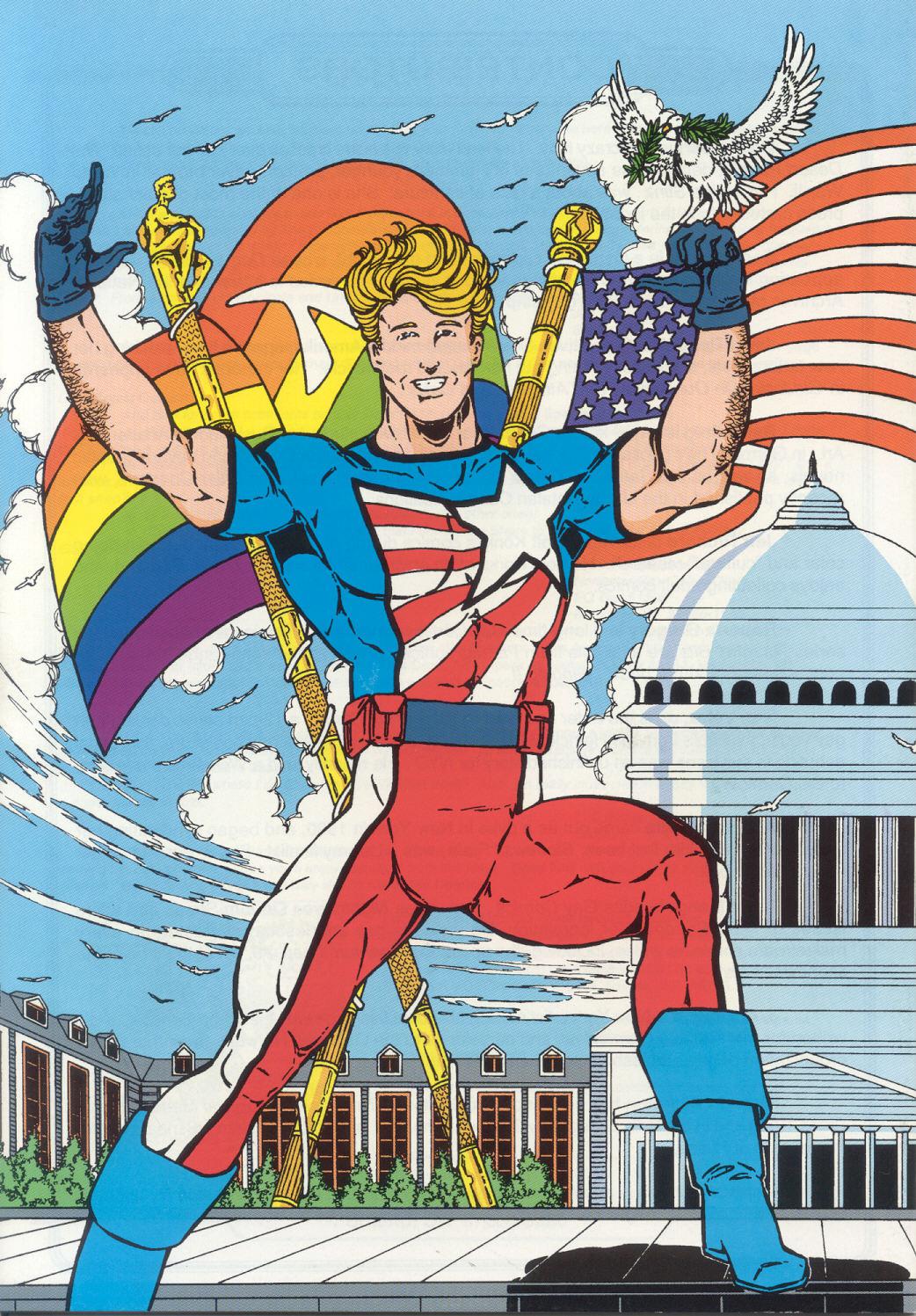 Elle représente un Sentinel/Pride triomphant, les bras levés. Posée sur sa main gauche, une colombe blanche porte une branche de laurier dans son bec. Le super-héros arbore son costume typique qui possède les couleurs et l’étoile du drapeau américain. Derrière lui, les drapeaux LGBT et américain flottent côte à côte. Deux sceptres en or se croisent devant les drapeaux. Un sceptre est coiffé en son sommet d’un globe, l’autre de la figure du Penseur. En arrière-plan, trône le Capitole, contemplant la scène, surplombé d’un ciel azur. Cette illustration est la première de tout Gay Comix qui lie de façon si directe l’expression de l’homosexualité avec l’expression du patriotisme. Sur cette image, État et Homosexualité cohabitent et s’inscrivent dans l’affirmation la plus franche de ce que Jasbir Puar nomme l’homonationalisme. L'homonationalisme définit le processus par lequel l’État intègre les droits LGBT dans le cadre de sa politique (inter)nationale pour justifier et renforcer des projets nationalistes, impérialistes ou néocoloniaux. En outre, l’homonationalisme, met en exergue la naissance d’une rhétorique liant l’exceptionnalisme national avec l’acceptation de l’homosexualité. Sur cette image, la colombe symbolise la Paix qui est littéralement hissée par une sentinelle qui devient, par métonymie, le messager de cette Paix. Comme les drapeaux l’indiquent, cette Paix est avant tout nationale mais la symbolique des sceptres appelle à son exportation : allégorie des pouvoirs régaliens, le sceptre surmonté du globe indique la dimension internationale du message que porte Sentinel. Le philosophe de l’autre sceptre, signifie le caractère éducateur de ce message qui se voit alors investi d’une dimension civilisatrice et impérialiste. Au fond, droit et rigide comme les lois qu’il édicte, sied le Capitole. Il est la matérialisation de l’État qui dirige dans l’intimité de son autorité. Cet État qui protège, punit. Un Léviathan. Taillé dans un bloc de marbre blanc immaculé, il est le Monolithe dont l’ombrageuse bienveillance s’étend jusqu’à son rejeton, dernier-né et déjà son plus fier ambassadeur ! Dans son ombre, virevoltent les couleurs de l’arc-en-ciel.