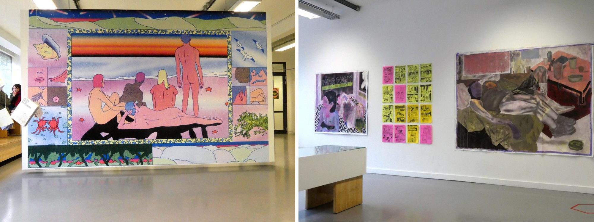 Les planches colorées de Melek Zertal allégorisent le désir en recettes et l’homosexualité se saupoudre de sucre-glace dans des séquences léchées. Les monotypes pastels de Romain Grostabussiat suggèrent un regard qui se dérobe pour se poser, malgré nous, sur un corps interdit. Les prints risographiés de Gabriel Mafféis sont des mémentos de bandes dessinées homofuturistes qui nous téléportent aux confins de futurs utopiques où les humains vivent sous des canopées abondantes et des cieux effervescents. Pour Garance Charlot-Carton l’intime est politique et l’art militant. Son travail hétéro-clit’ prolifère sur plusieurs supports qu’elle décline au travers d’une esthétique néo-punk et d’une graphiation « crado » qui pète des gueules. Dans ses strips qui reprennent l’esthétique des comix underground des 70’s, Garance raconte avec un humour aussi grinçant qu’intelligent son quotidien de jeune femme lesbienne vénère. Uy-Vinh Landru dessine l’ambigüe cohabitation entre le corps et le désir. Son trait, profondément poétique, délinée avec harmonie des contours d’hommes endormis dans des paysages de songes. La torpeur de ses estampes est perturbée par la violence qui s’y invite par le truchement d’un bestiaire infernal : un colonne ver-tébrale, des cerbères qui s’arrachent la carcasse d’un homme, des moutons qui s’abreuvent d’urine. Fébriles et puissants, brutaux et poétiques, les dessins de Uy-Vinh dressent le portrait d’une sexualité qui cherche ses propres frontières