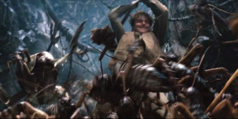 Un héritage important... trop important ?Dès l'introduction, Jackson affirme sa filiation avec le film de Cooper et Schoedsack en situant l'action en 1933 et en proposant un déroulé quasi-identique. Le cinéaste injecte néanmoins une touche très personnelle au long-métrage, à travers le personnage de Carl Denham (Jack Black), petit réalisateur aux allures de Orson Welles tentant de faire valoir son regard artistique face à de producteurs vénaux. De manière générale, Jackson offre son œuvre la plus personnelle jusqu'à ce jour. La première partie du film nous immerge dans les années 30 post krach boursier. Elle prend le temps de nous présenter les personnages embarqués malgré eux sur un bateau les menant vers un lieu rempli de dangers. Le voyage en bateau ne cesse de faire grandir le mystère et l'inquiétude concernant la terrible Skull Island. C'est dans la seconde partie du métrage, lorsque Jackson nous fait pénétrer sur l'île que le réalisateur donne libre court à sa créativité pour donner vie au lieu. Dès leurs premiers pas, l'équipe de Denham est confrontée aux indigènes locaux. Ces derniers instaurent une tension horrifique qui insiste sur l'omniprésence de la mort, de la cruauté et de l'animalité. La faune, quant à elle, rassemble dinosaures, créatures aquatiques et insectes aux dimensions titanesques dans une jungle labyrinthique étouffante. Jamais, dans les différentes versions de King Kong, l'île n'a été aussi vivante et organique que dans cette version. Le cinéaste prend un plaisir immense à offrir une identité propre à cette terre et à la rendre la plus oppressante, terrifiante et démesurée possible. Comme dans le film de 1933, l'homme vient ici profaner un lieu où il n'est pas le bienvenu. L'espace est hors normes et hors du temps. Domine rapidement, un sentiment de désespoir envers ces protagonistes faisant route vers une mort presque certaine dans ce qui s'apparente à une version radicale du Monde Perdu de Conan Doyle. Jackson offre aux spectateurs un assemblage hors du commun de séquences dantesques. Il assume une forme de jusqu'au-boutisme absolu dans sa façon d'accommoder les péripéties. La séquence de la fosse aux insectes géants constitue certainement le point culminant de ce musée des horreurs rappelant les débuts de carrière du cinéaste. |