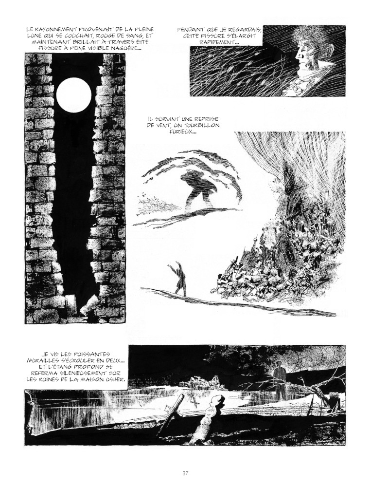 La dernière planche de la bande dessinée se concentre en toute logique sur l’excipit du récit. Le narrateur a tout juste eu le temps de sortir de la maison pour voir la fissure gagner tout le bâtiment. C’est ce que nous représente la première case, tout en verticalité : à travers la large brèche dans la façade, on voit même la pleine lune briller au milieu de la nuit. La case suivante, en haut à gauche, nous dépeint le regard halluciné du narrateur tourné vers cette fissure, ne pouvant s’arracher au spectacle terrifiant qui s’offre à lui. Deux images sans cadre se succèdent sous cette case, montrant la précipitation confuse de l’action : d’abord celle d’« un tourbillon de vent [qui] se déchaîna », entraînant à sa suite un nuage de poussières qui enveloppe le narrateur, et puis celle du bâtiment, à moitié détruit, devant lequel le narrateur ne peut plus contenir sa stupeur. Enfin, la dernière case, tout en horizontalité cette fois-ci, découvre le personnage principal, dans le lointain, au milieu des décombres imperceptibles, avec au premier plan « l’étang sombre se referma[nt] dans son silence sur les ruines de la maison Usher ».