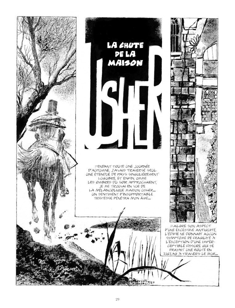 La première planche de Battaglia positionne le titre, imposant et graphique, en haut de la page. Ensuite, deux cases se partagent le reste de l’espace, séparées l’une de l’autre par deux récitatifs condensant l’incipit de la nouvelle. La première case, la plus grande, est composée en escalier, épousant l’angle inférieur gauche de la page. Elle représente le narrateur de dos, sur son cheval, dominant un étang qui s’étale sur toute la largeur de la planche, tandis qu’un arbre décharné le domine. Le dessin gratté figure la brume, achevant ainsi de planter ce climat oppressant de mélancolie et de malaise qu’évoque le narrateur en arrivant devant la Maison Usher. L’autre case, située à droite, consiste en un insert représentant en gros plan une partie de la fissure sur le mur de la demeure, sinueuse ligne noire se frayant un chemin parmi les briques. Battaglia plonge le lecteur à la suite du narrateur dans l’atmosphère fantastique du récit. La représentation du personnage de dos fait qu’on le suit, littéralement. Par ailleurs, le dessinateur ne donne pas à voir au lecteur une vue générale du château, mais directement une petite partie sur laquelle s’est focalisée la perception du narrateur : un détail significatif, une « fissure imperceptible », mais mise en valeur sur la planche de manière à ce qu’on ne voit qu’elle. Une synecdoque est alors mise en œuvre, qui résume l’édifice à une fissure. Cette faille peut à son tour se voir comme une métaphore du fantastique, l’extraordinaire se réalisant toujours à travers une fêlure dans les apparences du réel. Le château s’apparente alors à une brèche dans la réalité, à travers laquelle le surnaturel va faire irruption dans le récit, ou réciproquement : comme si en pénétrant dans le château, on entrait de plein pied dans l’étrange.