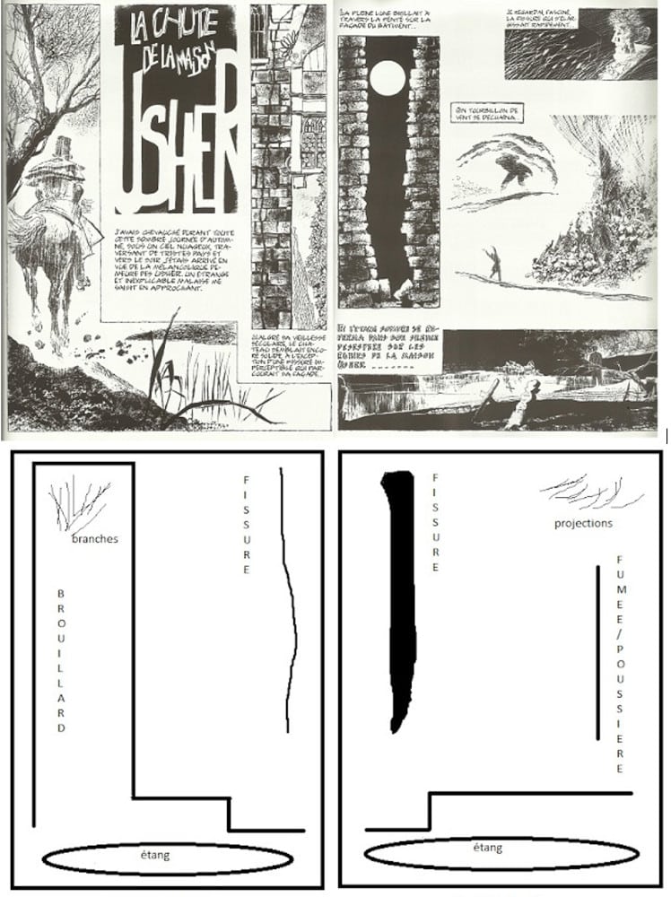 width=Ce miroir de l’étang, qui renverse le réel, il appelle aussi à reconsidérer la planche, comme pour en rechercher le reflet. L'horizontalité de la dernière case, épousant l’étendue de l’étang, et la verticalité de la première, adaptée à la fissure qui y est représentée rappellent quelque chose. L’étang se retrouve en effet au même endroit dans la première et la dernière planche, en bas sur toute la largeur de la page, tandis que les cases avec la fissure, presque identiques dans leur forme, occupent une position diamétralement inversée dans l’espace. Une symétrie se dessine alors entre la première et la dernière planche, comme si l’une était le reflet de l’autre. En effet, on constate que la case du bas de la page a la même forme en escalier, en raison de la position contraignante du récitatif, mais inversée. Par ailleurs, la case en angle droit de la première planche, qui menaçait de vaciller en raison des dynamiques contraires de la verticalité et de l’horizontalité se retrouve décomposée dans la dernière planche, toujours dans l’inversion, comme si l’implosion prophétisée par son déséquilibre originel s’était réalisée. Dans l’intervalle, la verticalité s’est effondrée, morcelée et affaissée. L’équilibre précaire de la toute première case, représentatif d’une réalité prête à céder le pas au surnaturel, s’est écroulé dans la dernière planche en se laissant envahir par le fantastique. Ce n’est plus seulement la Maison Usher qui est détruite ici, mais la case initiale, sa décomposition presque abstraite favorisant le triomphe de l’indicible et du surnaturel sur la lisibilité de la représentation. Car on retrouve néanmoins beaucoup d’éléments qui rappellent la première case : le nuage de poussière renvoie à la brume qui enveloppait le narrateur à son arrivée (avec la même technique du grattage, qui fait se rapprocher la masse sombre du narrateur et de son cheval de celle du bâtiment en ruine) et les traits blancs qui jaillissent au-devant du narrateur font écho en les inversant aux traits noirs des branches dénudées qui surplombaient à l’origine la scène. Les deux planches sont donc symétriques, miroir l’une de l’autre, et cette symétrie incarne le renversement du réel vers le fantastique, le passage de l’autre côté, une totale inversion des valeurs. Mais cet effet miroir représente aussi la fatalité, puisqu’ainsi le début donnait déjà une image de la fin. La symétrie renvoie donc à au phénomène de la hantise et son inlassablement retour sur elle-même, ainsi que l’inéluctabilité de la destinée qui s’accomplit telle qu’elle a été prévue au commencement, et sur laquelle le narrateur et Roderick n’ont pas réussi à avoir de prise, enfermés entre cette parenthèse qui trouve sa fin dans ses origines.